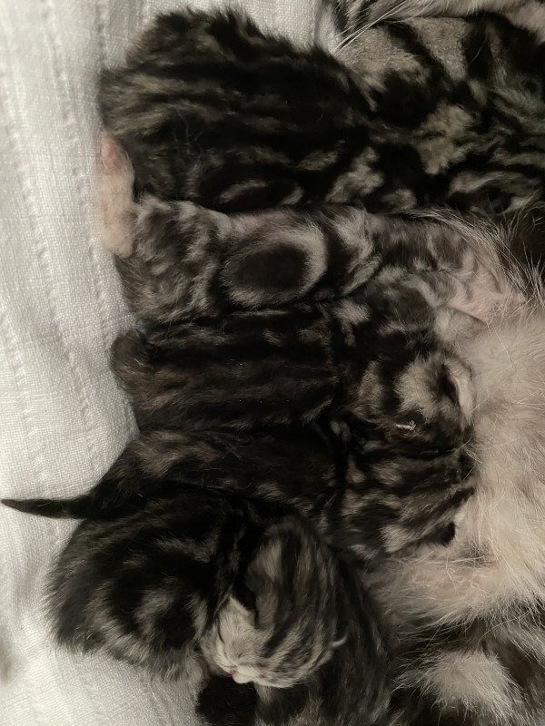všechna koťátka mají barvu kožíšku po mamince tj černá stříbřitě nramorovaná s klasickou kresbou