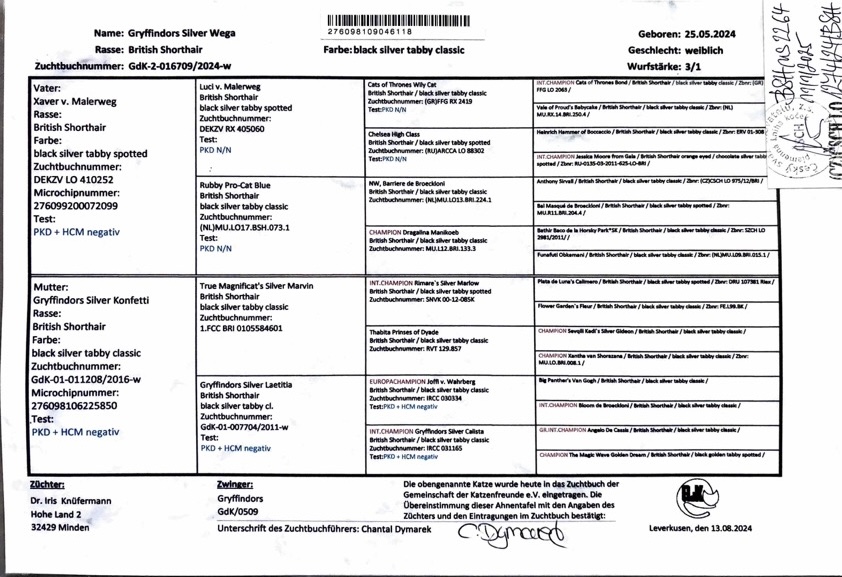 A teď už tedy ke kočičce, která se jmenuje Gryffindors Silver Wega a část jejího rodokmenu je stejná jako u Serafinky. Narodila se v Německu 25.5.2024. Když jsme si pro ni přijeli, nebyla z nás zrovna moc nadšená, nechtěla trávit čas v přepravce a dlouhá cesta pro ni byla opravdovým utrpením. Po příjezdu do našeho domu potřebovala vydat veškerou nashromážděnou energii. Wega potřebovala prozkoumat knihovnu, komody a vitrínu hlavně pěkně shora. Hned na začátku nám ukázala, že umí uklízet veškeré věci, které ji brání v rozhledu pěkně dolů na zem a snažila se nás přesvědčit, že některé věci jsou tady u nás zbytečné. Její začátky v našem domě byly opravdu veselé.