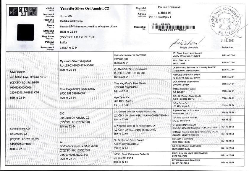 Yennefer se narodila v naší chovatelské stanici, jejími rodiči jsou Schrödinger's Cat a Silver Lucifer, po rodičích je nesmírně mazlivá, k návštěvám trochu ostražitá, ale velice chytrá a hodná kočička. Kožíšek má černý lesklý se světle stříbrným základem. Vzor kresby není jasný, pouze jako duch leží na její srsti, můžete ho vidět za slunečného počasí.